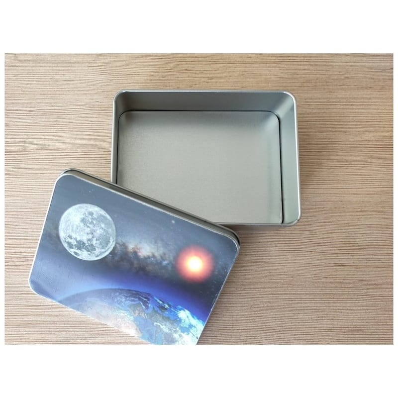 3D Aarde deksel: De deksel van het tin boxje is voorzien van een gedetailleerde afbeelding van de aarde en de maan, met de zon die schijnt in de verte en op de achtergrond de Melkweg.