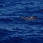 Het goede gevoel bleek helemaal juist. Maar liefst vier (!) potvissen, gevlekte dolfijnen, Sowerby’s beaked whale (spitssnuitdolfijn) – een zeldzaamheid omdat ze erg schuw zijn, gewone dolfijnen, een onechte caretschildpad (Caretta caretta). Ook dreef er nog ergens een Portugees oorlogsschip, dit is een gevaarlijke kwal met tentakels van minstens 10 meter lang. Daar wil je niet door geprikt worden.