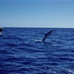 De tweede soort die wij tegenkwamen was een vrij grote groep Tuimelaars (Tursiops truncatus), bij de (iets) ouderen onder ons wel bekend als Flipper. Hij heet in het Nederlands niet voor niets ‘Tuimelaar’. Het is een waar genot om ze een tijdje te mogen meemaken. Overigens bieden beide bedrijven ook ‘swimming with dolphins’ aan. Je krijgt dan een wetsuit aan en springt het water in als er een groep dolfijn gevonden wordt die wel meewerken. Zwemmen met dolfijnen is aan strikte wettelijke regels gebonden, de dieren mogen nergens toe gedwongen worden en aanraken is uit den boze. Dus hangend aan de vin van Flipper het onrecht op zee bestrijden is er niet bij. We gingen blij weer terug naar kant, maar toch was er heel in de verte in een uithoek van het brein een heel klein dompertje: we hadden geen walvis gezien…….