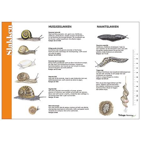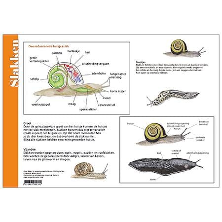 Op deze herkenningskaart / zoekkaart staan de meest voorkomende slakken van ons land afgebeeld. Op de achterzijde vind je onder andere informatie over de anatomie van een slak