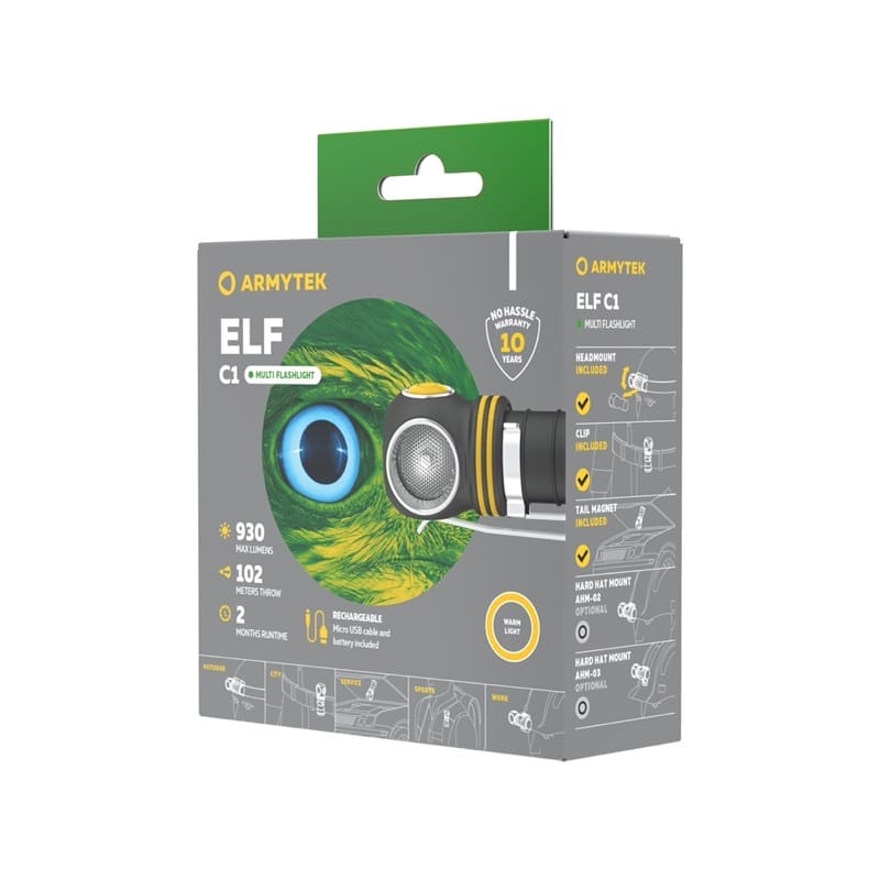 De Armytek ELF C1 micro USB hoofd- en zaklamp is verkrijgbaar in een uitvoering met warm licht en een uitvoering met koel wit licht.