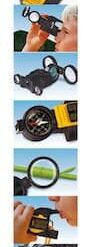 - Verrekijker: Klap de lensen voor en achter uit en je hebt een verrekijker. Er zit een wieltje op om de verrekijker scherp te stellen. Je kunt hem ook als monokijker gebruiken. Dan klap je maar één lens voor en achter uit.