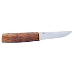 Dit Fins mes is 100% met de hand vervaardigd. Het handvat is van gekrulde berk (net wat steviger dan de gewone berk) dat de maker (Mikko Takala) uit zijn eigen bos heeft geselecteerd. Aan dit mes is ongeveer 20 uur gewerkt.
